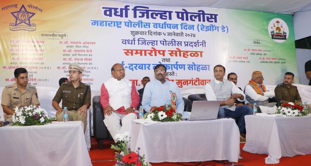 महाराष्ट्र पोलिस दलाच्या वर्धापन दिनानिमित्य पोलिस मुख्यालयाच्या प्रांगणात दोन दिवशीय प्रदर्शनीचे आयोजन करण्यात आले होते. या प्रदर्शनीचा समारोप व ई-दरबारचा शुभारंभ पालकमंत्री मुनगंटीवार यांच्याहस्ते झाला. त्यावेळी ते बोलत होते. यावेळी खा. रामदास तडस, आ. रामदास आंबटकर, आ. दादाराव केचे, आ.डॉ. पंकज भोयर, जिल्हाधिकारी राहुल कर्डिले, जिल्हा पोलिस अधीक्षक नुरूल हसन, अपर पोलिस अधीक्षक डॉ. सागर कवडे यांच्यासह विविध विभागाचे अधिकारी उपस्थित होते.