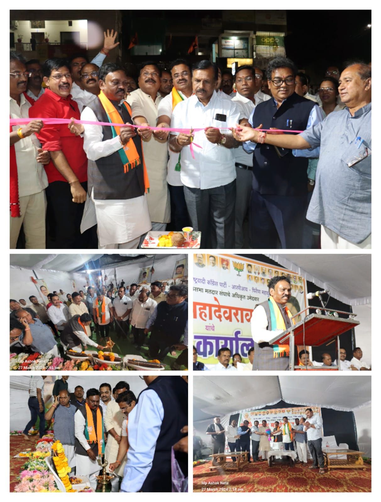 प्रतिनिधी / गडचिरोली : काल २७ मार्च २०२४ बुधवारी भारतीय जनता पार्टी- शिवसेना- राष्ट्रवादी काँग्रेस पार्टी- आरपीआय- पिरिपा महायुतीचे गडचिरोली चिमूर लोकसभा मतदार संघाचे अधिकृत उमेदवार अशोक महादेवराव नेते यांच्या प्रचारार्थ प्रचार कार्यालयाचे रितसर उद्घाटन लोकसभा प्रभारी अतुल देशकर यांच्या हस्ते गडचिरोली येथील खासदार अशोक नेते यांच्या जनसंपर्क कार्यालय चामोर्शी रोड, गडचिरोली येथे करण्यात आले.