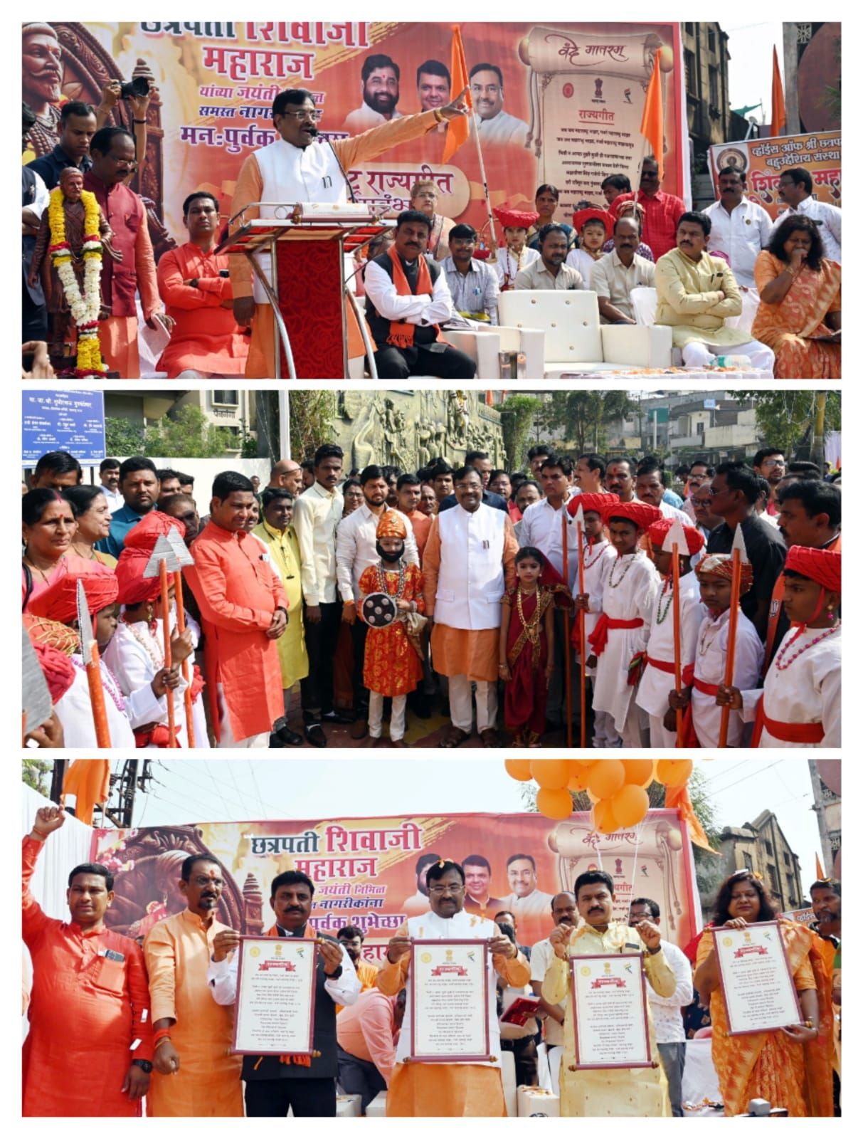 कार्यक्रमाच्या सुरवातीला सांस्कृतिक कार्यमंत्री मुनगंटीवार यांच्या हस्ते लखोटा उघडून राज्यगीताचा शुभारंभ करण्यात आला. तत्पूर्वी शिवस्मारकाला अभिवादन करून मुनगंटीवार यांनी रक्तदान शिबिराचे उद्घाटन केले. यावेळी भगव्या ध्वजाचे ध्वजारोहण करून भगवे फुगे आकाशात सोडण्यात आले. जगदंबा ढोल-ताशांच्या निनादात जय भवानी जय शिवाजी चा जागर करण्यात आला. विक्की दुपारे व विजय पारखी यांनी राज्यगीत सादर केले.