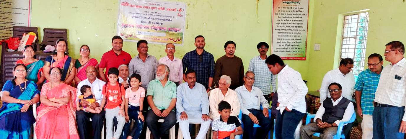 विदर्भ कुंभार समाज सुधार समिती व समाजोन्नती समिती गेल्या सहा वर्षांपासून दिवाळीनिमित्य वृध्दाश्रमात जेष्ठांसोबत स्नेहमिलन कार्यक्रम सातत्यपूर्ण आयोजित करीत आहे आणि दरवर्षी आपण आपल्याच जीवनाच्या उतरणीची वाट अधिक जवळून समजून घेत असल्याचा प्रत्यय अनुभवत आहे. येथे आल्यानंतर मनाला शांती मिळते. काही क्षण का होईना संसार चक्रातून मुक्त झाल्याचे जाणवते. येथे आल्यानंतर एवढे मात्र निश्चित जाणवते की,व्यक्तिच्या जीवनातील मान-मरातब, रूतबा, ऐश्वर्य, सामाजिक राजकीय आर्थिक स्तर मृगजळ आहे. अंतिम सत्य हेच आहे की आयुष्याच्या उतरणीवर मनःशांती नसेल तर सर्व व्यर्थ आहे अशा भावना याप्रसंगी व्यक्त करण्यात आल्यात. दिवाळीनिमित्त हा कार्यक्रम आयोजनासाठी कुंभार समाजातील बांधवांना देणगी स्वरूपात रक्कम समितीकडे दिली होती. सर्व पदाधीकाऱ्यानी या कार्यासाठी सहकार्य केले असून त्यांच्याप्रती याप्रसंगी विदर्भ कुंभार समाजाचे अध्यक्ष डॉ. सुधाकर शेंडोकार यांनी आभार मानले.